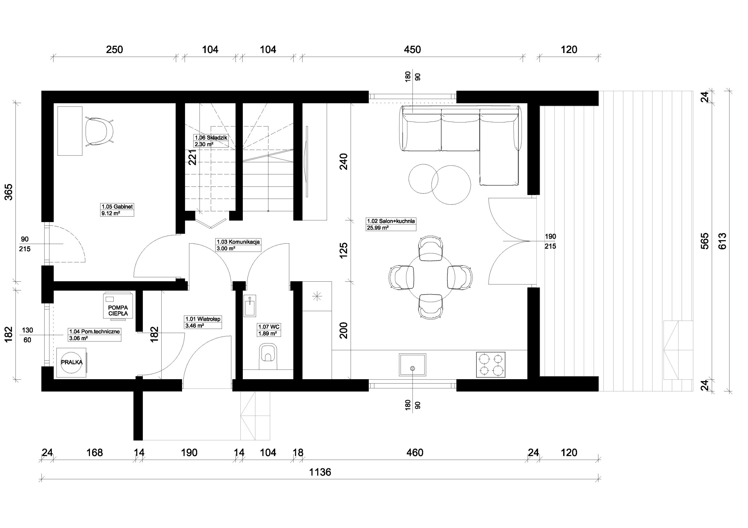 Dom został zaprojektowany z myślą o maksymalnym wykorzystaniu przestrzeni i składa się z dwóch poziomów – parteru i poddasza, z których każdy ma po 50 m². Parter to otwarta przestrzeń, łącząca salon z kuchnią, co czyni go idealnym miejscem do życia rodzinnego i rozrywki. Znajdziesz tu również komfortowe WC oraz wielofunkcyjny gabinet, idealny na domowe biuro lub dodatkową sypialnię.