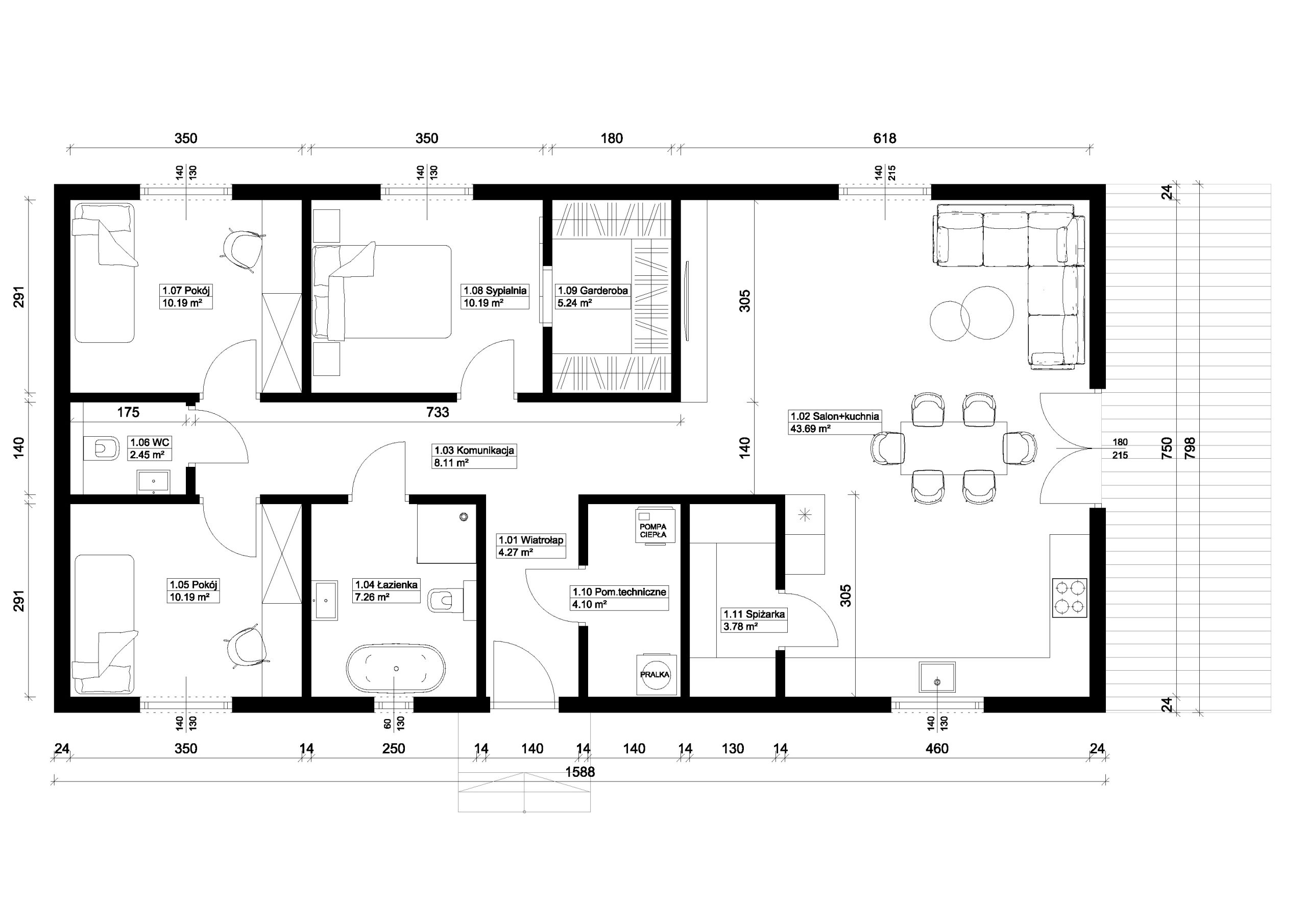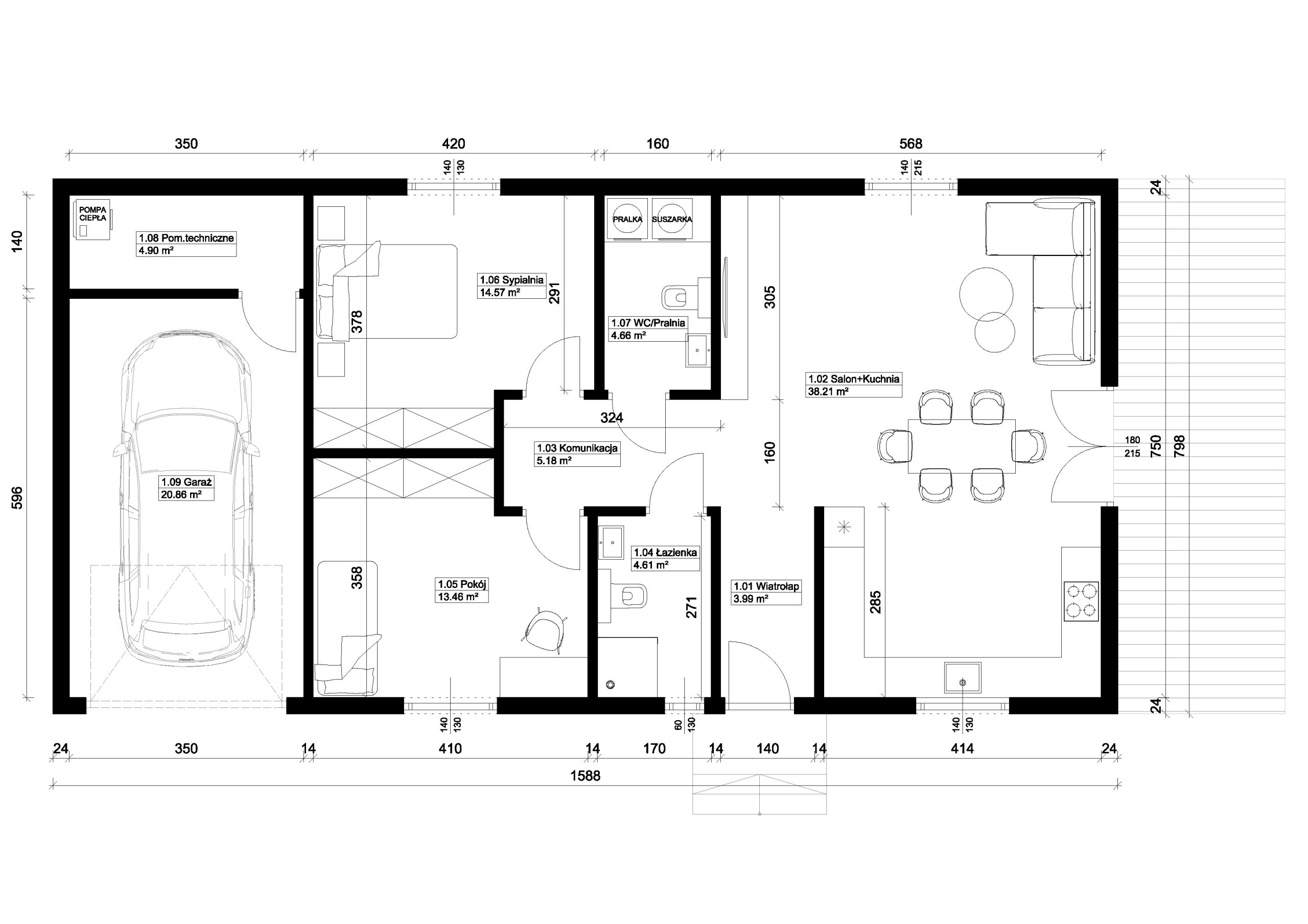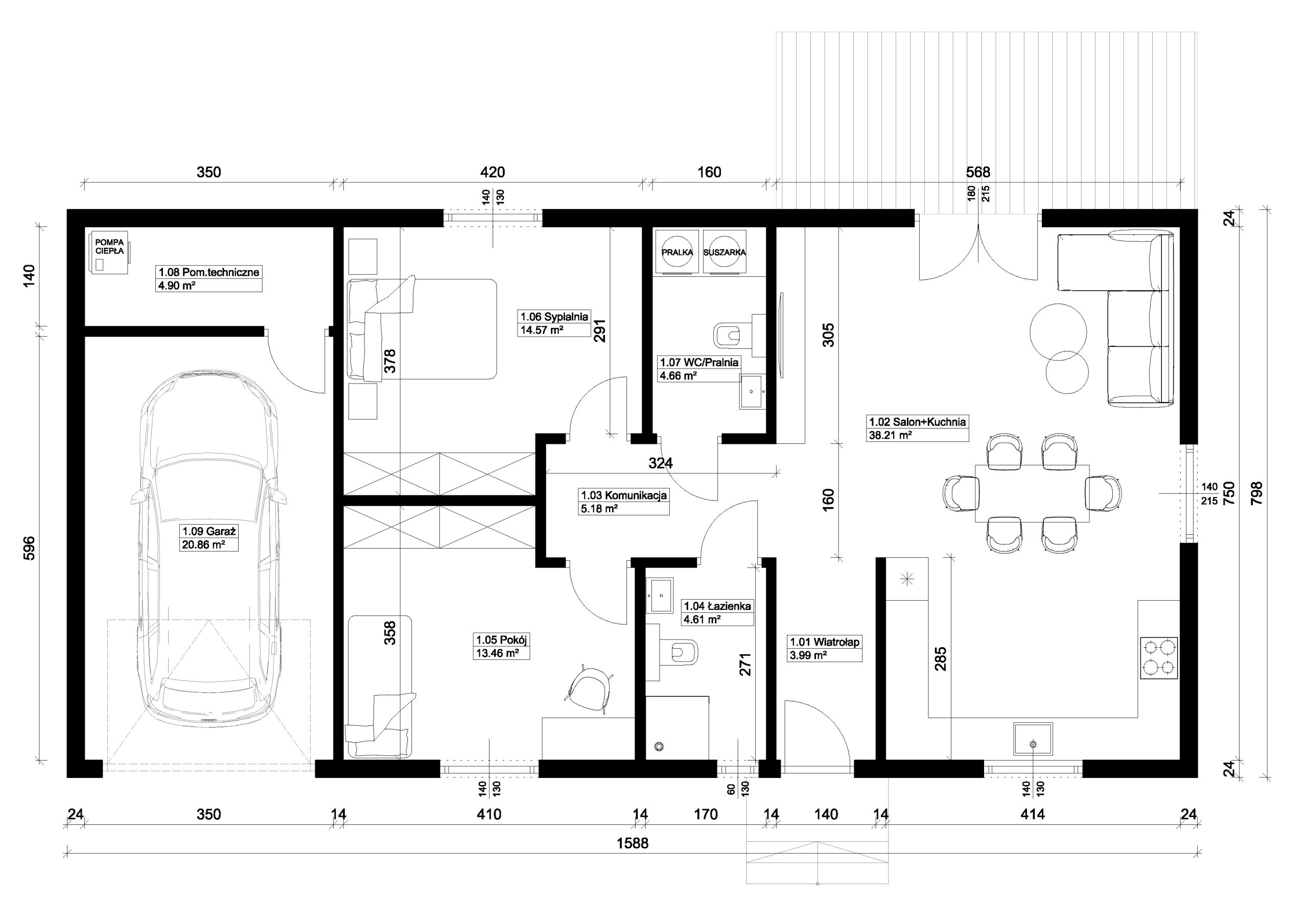 Tradycyjny podział na strefę dzienną i nocną sprawi, że zarówno mieszkańcy jak i ich goście będą czuli się w nim komfortowo. Dom jest przestronny i bardzo jasny dzięki zastosowaniu dużych przeszkleń.