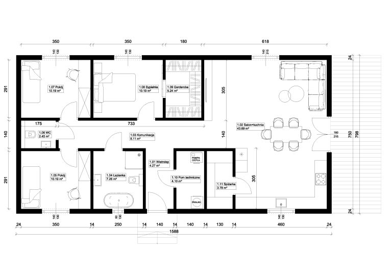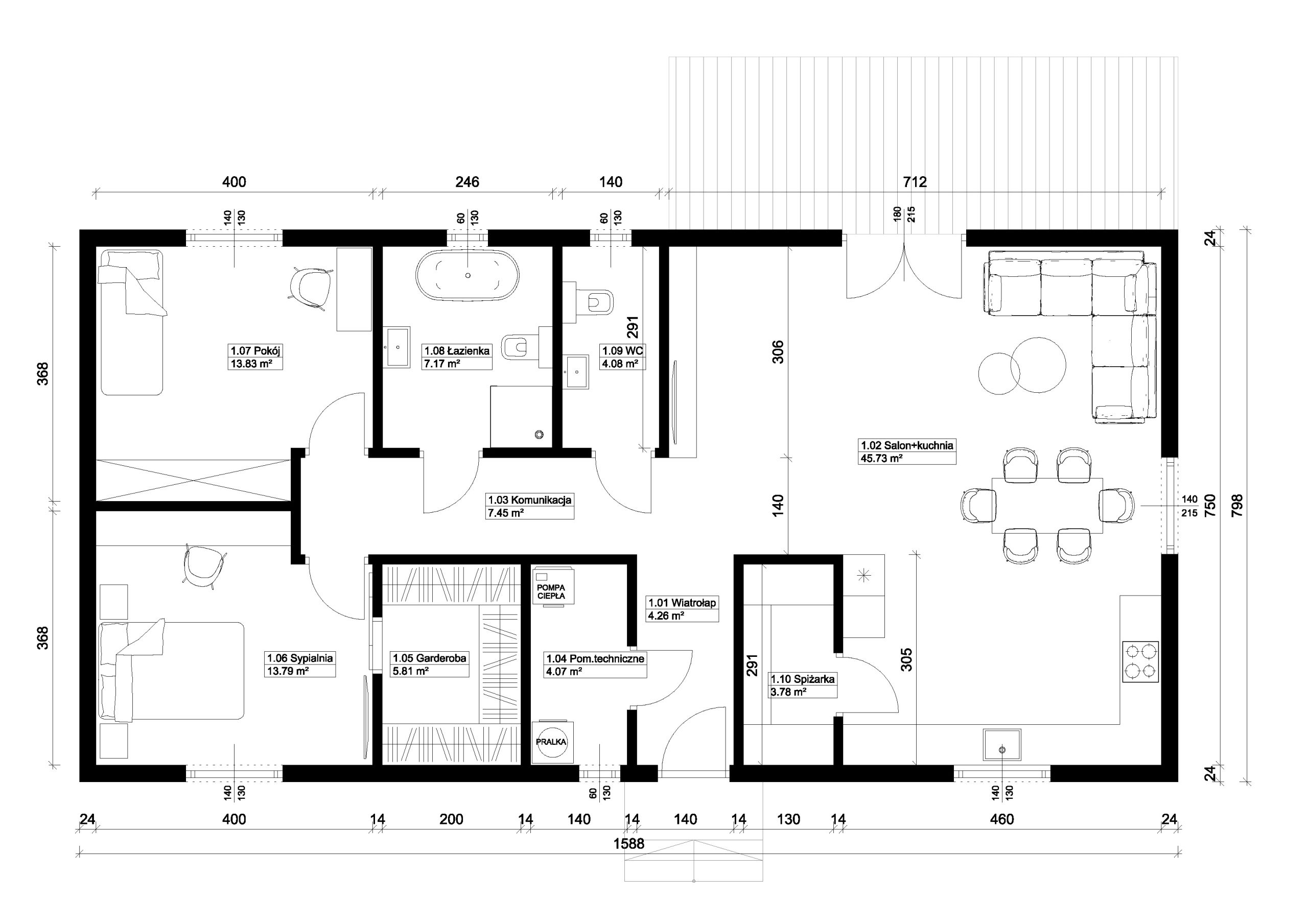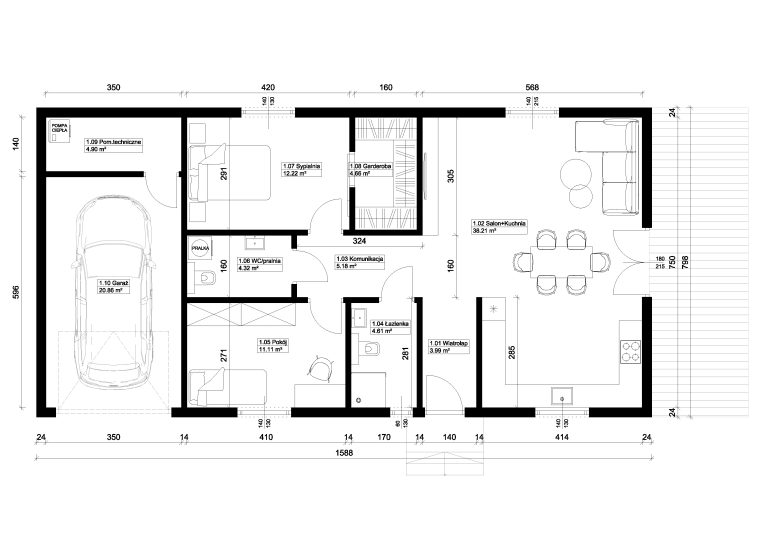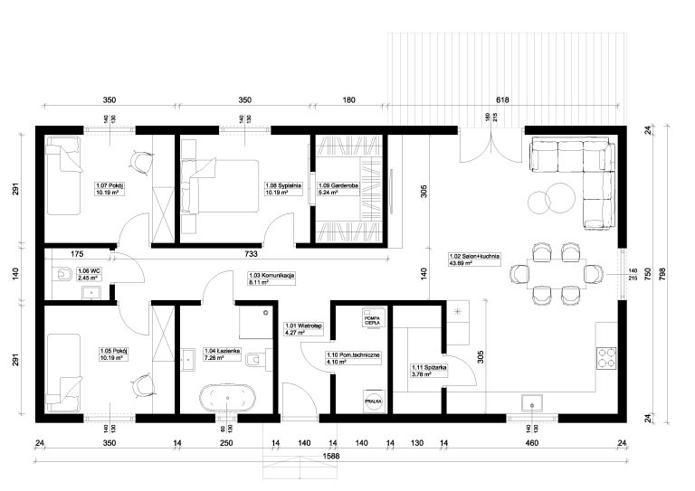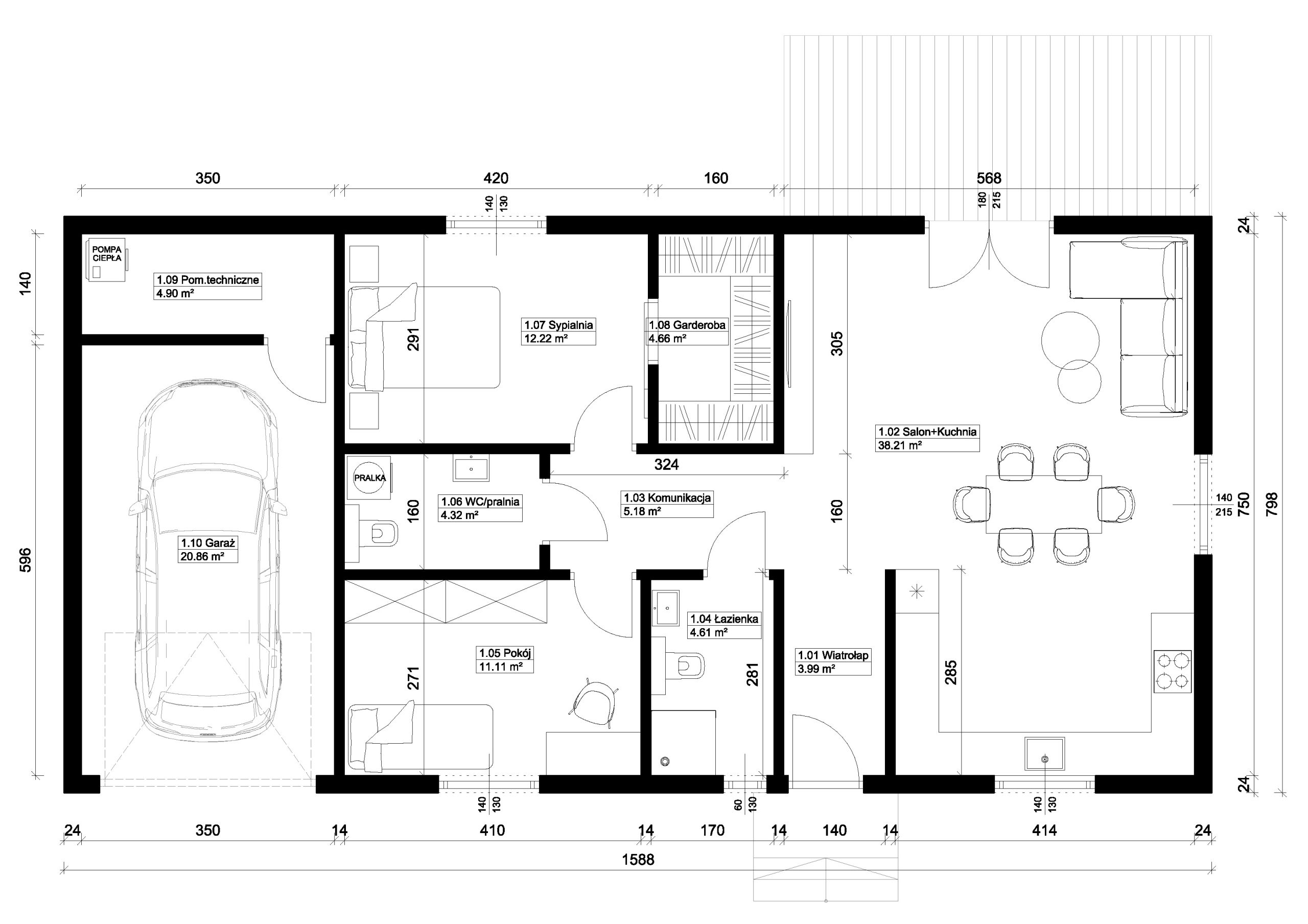 Tradycyjny podział na strefę dzienną i nocną sprawi, że zarówno mieszkańcy jak i ich goście będą czuli się w nim komfortowo. Dom jest przestronny i bardzo jasny dzięki zastosowaniu dużych przeszkleń.