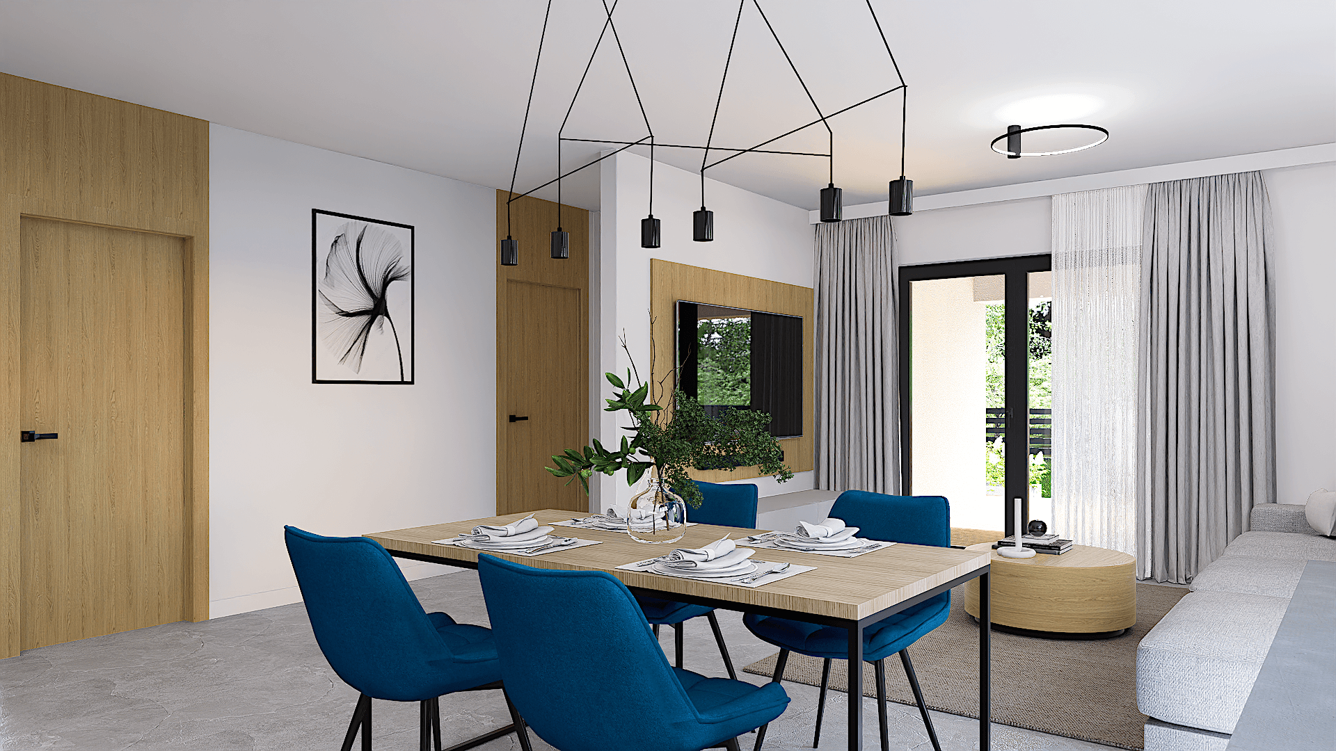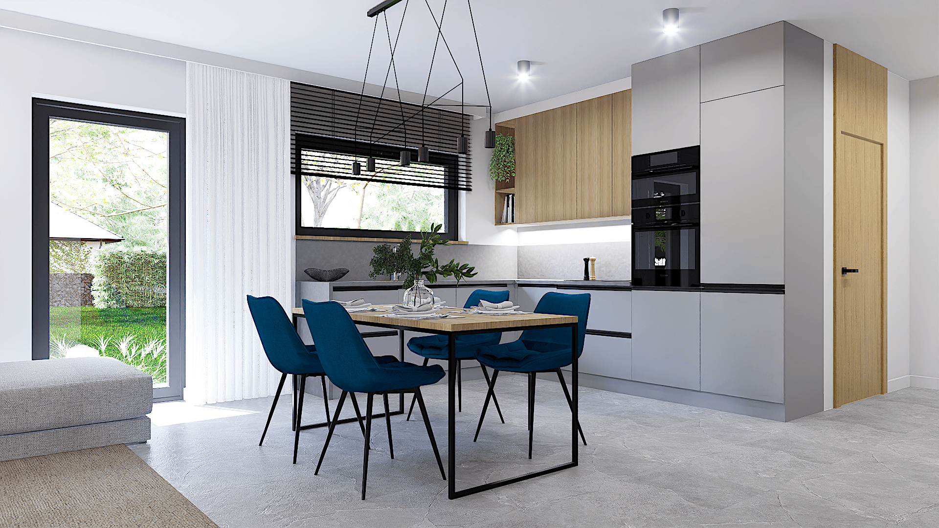 Na uwagę zasługuje obszerny salon z aneksem kuchennym i miejscem na duży stół, gdzie wszyscy domownicy będą mogli wspólnie celebrować posiłki.
