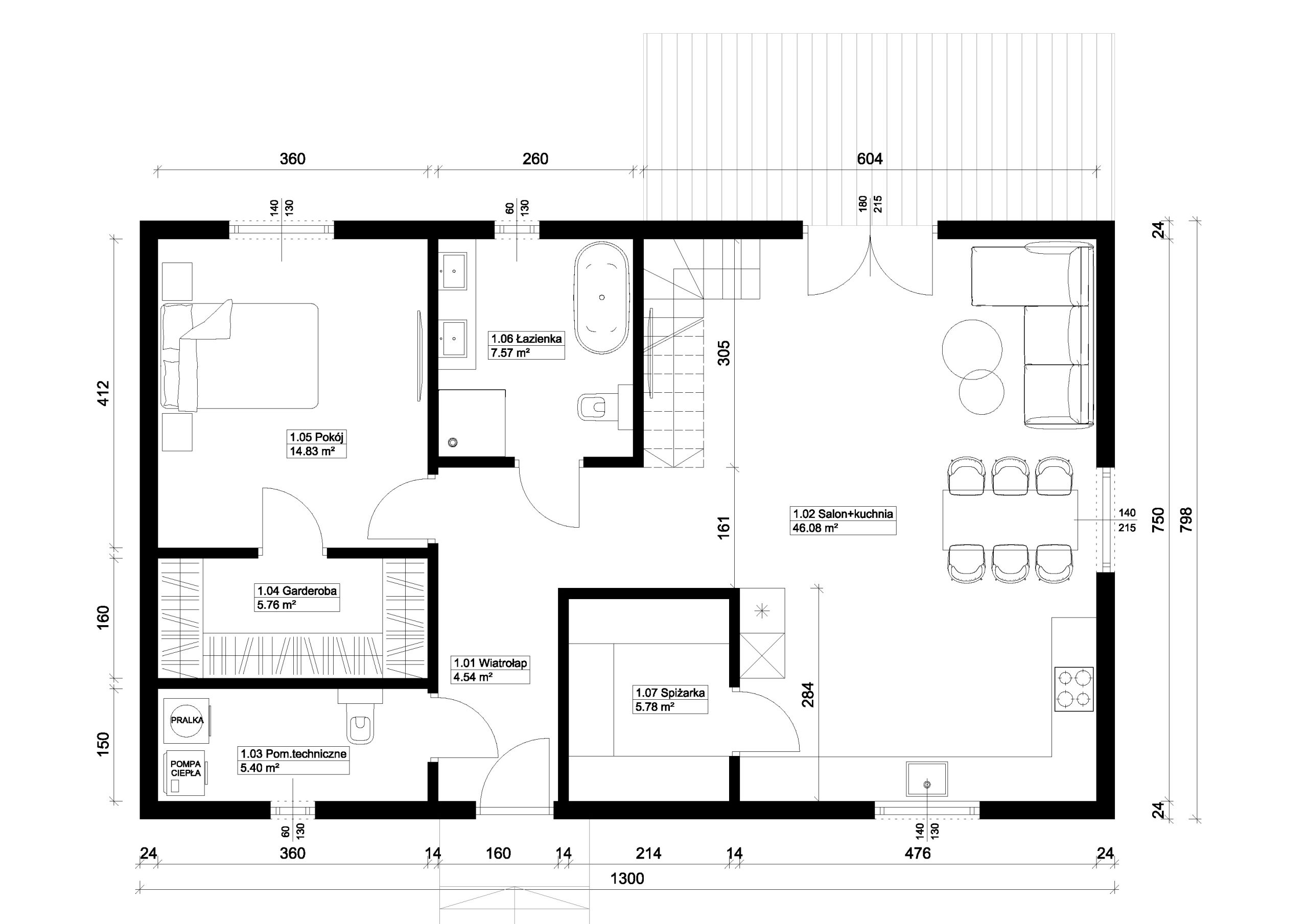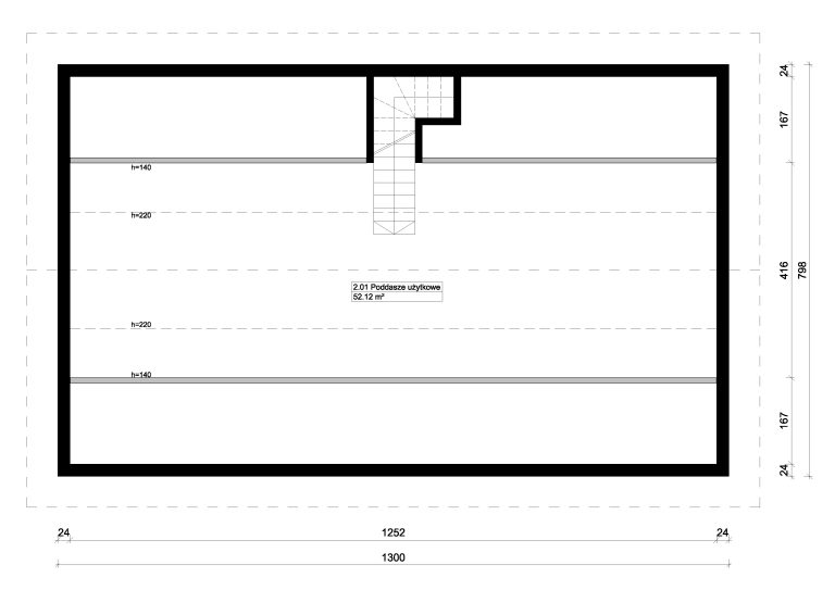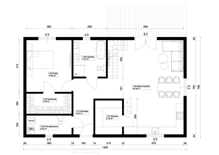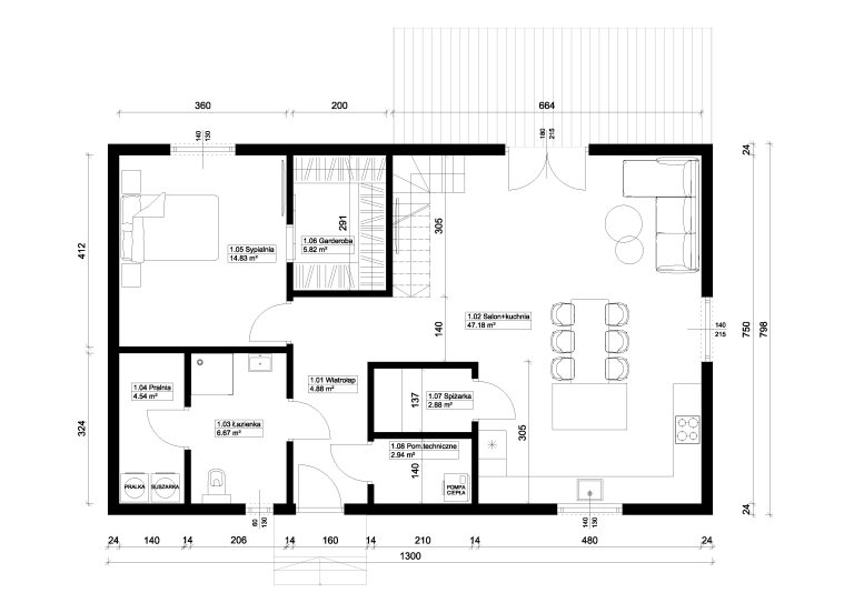 Tradycyjny podział na strefę dzienną i nocną sprawi, że zarówno mieszkańcy jak i ich goście będą czuli się w nim komfortowo. Dom jest przestronny i bardzo jasny dzięki zastosowaniu dużych przeszkleń.