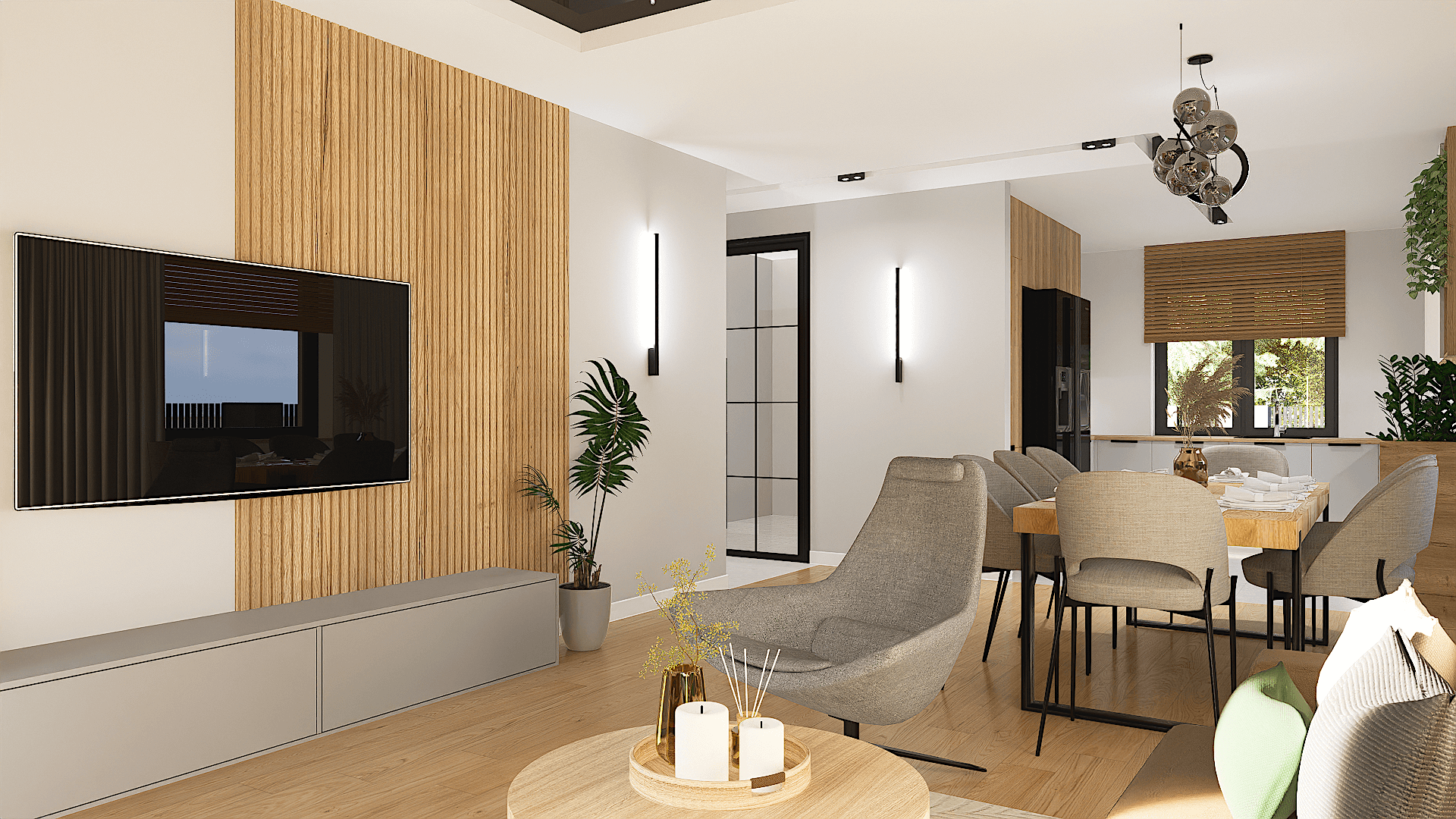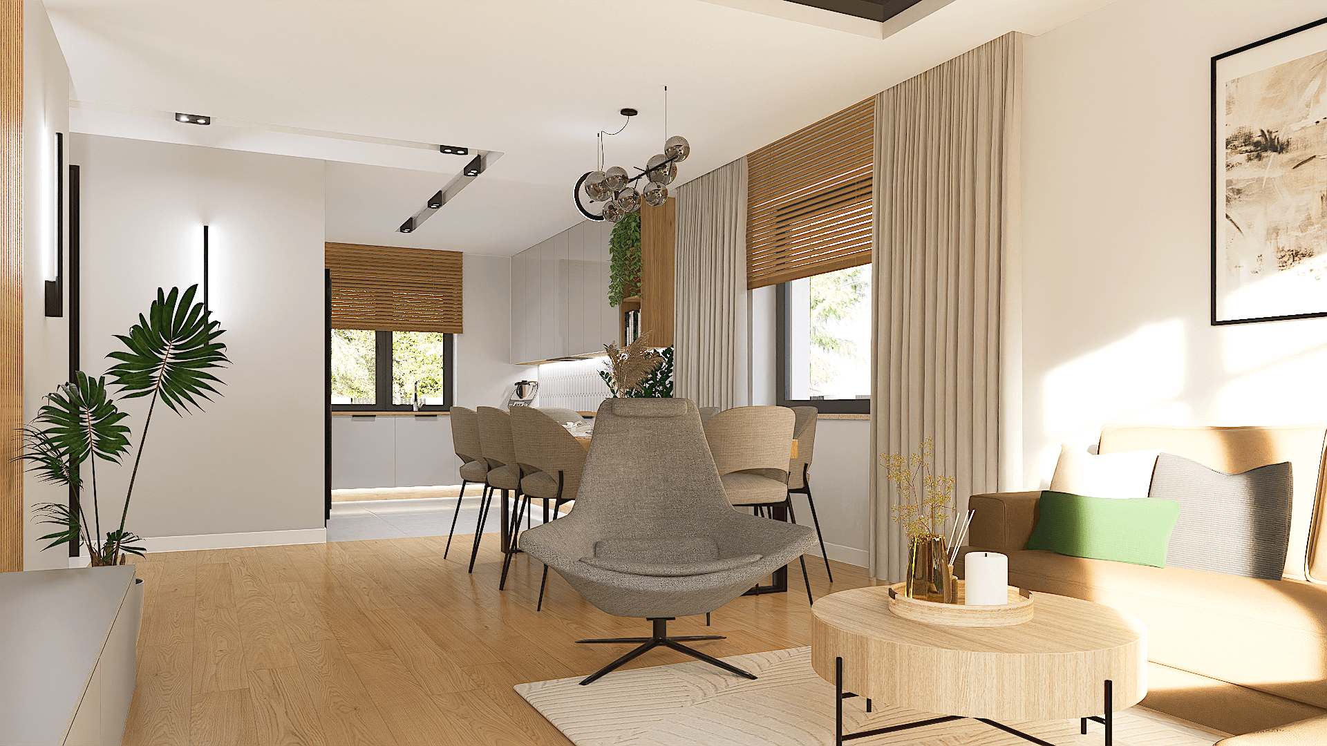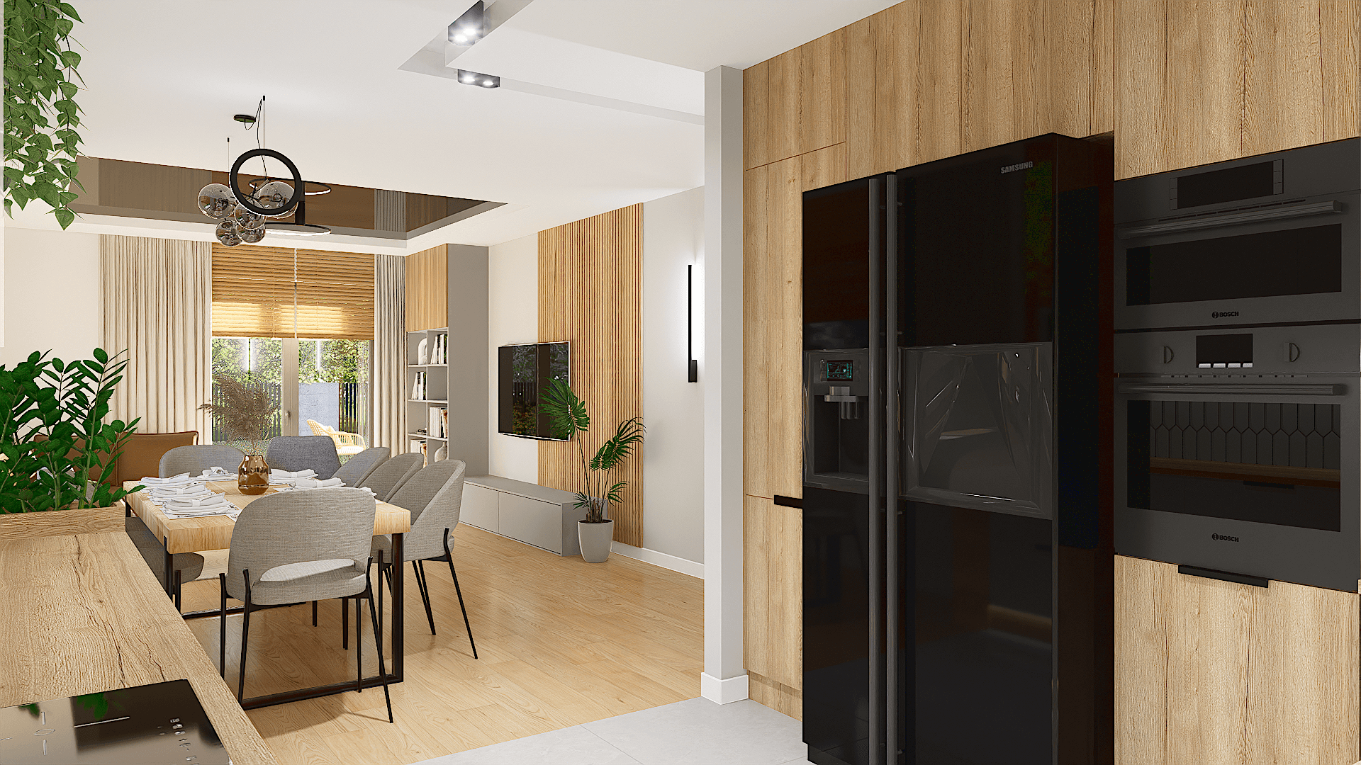 Na uwagę zasługuje obszerny salon z aneksem kuchennym i miejscem na duży stół, gdzie wszyscy domownicy będą mogli wspólnie celebrować posiłki.