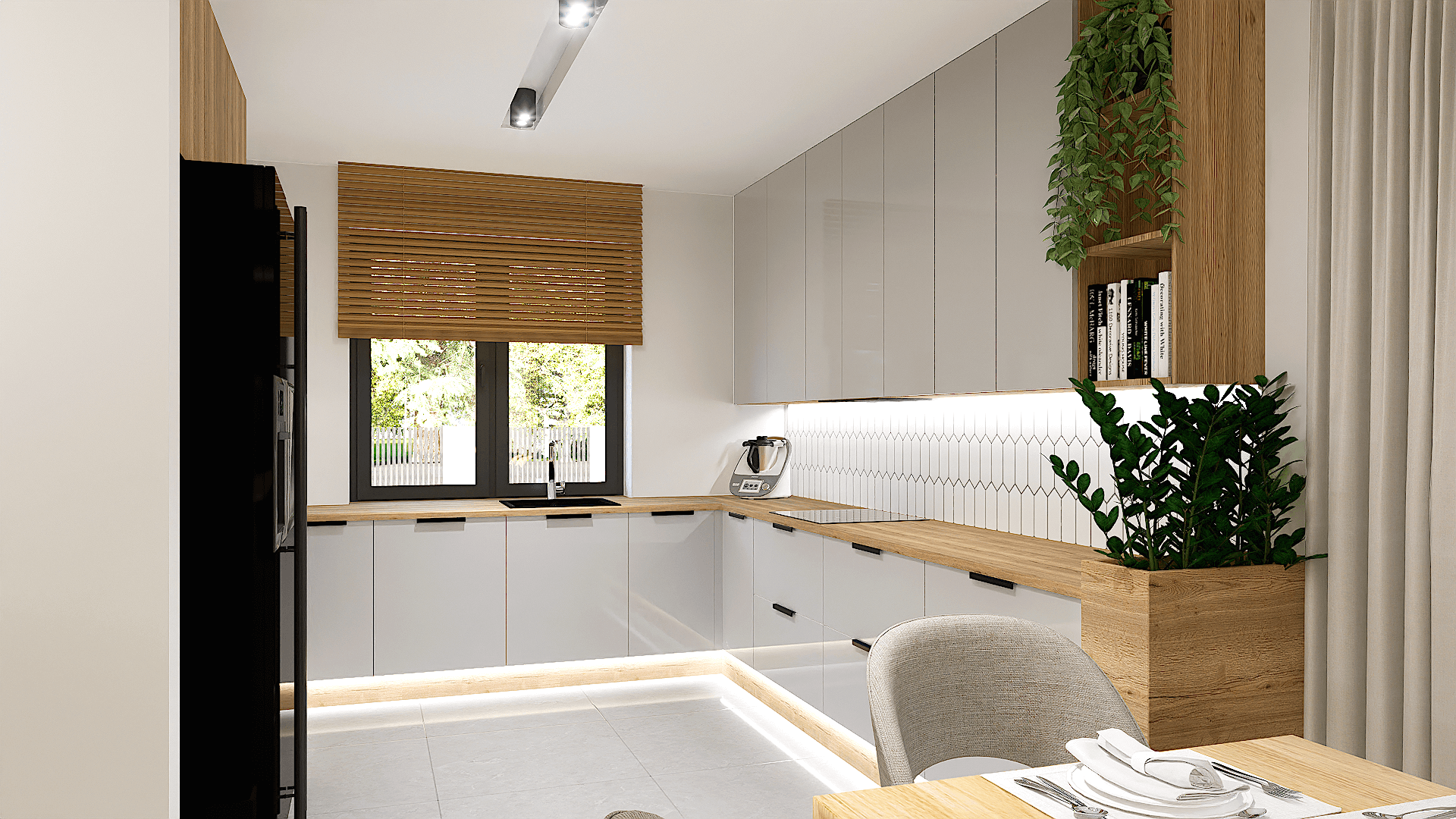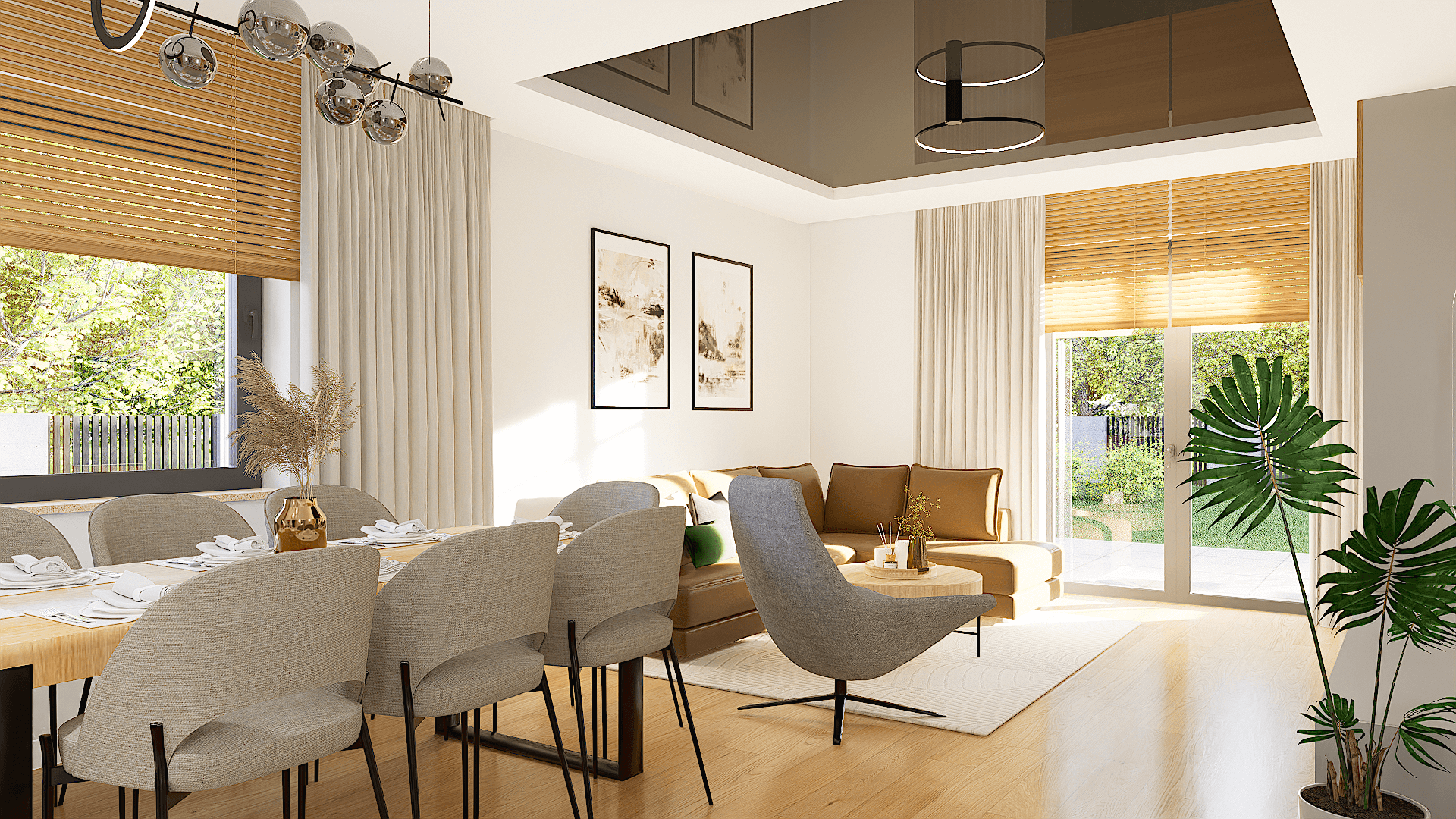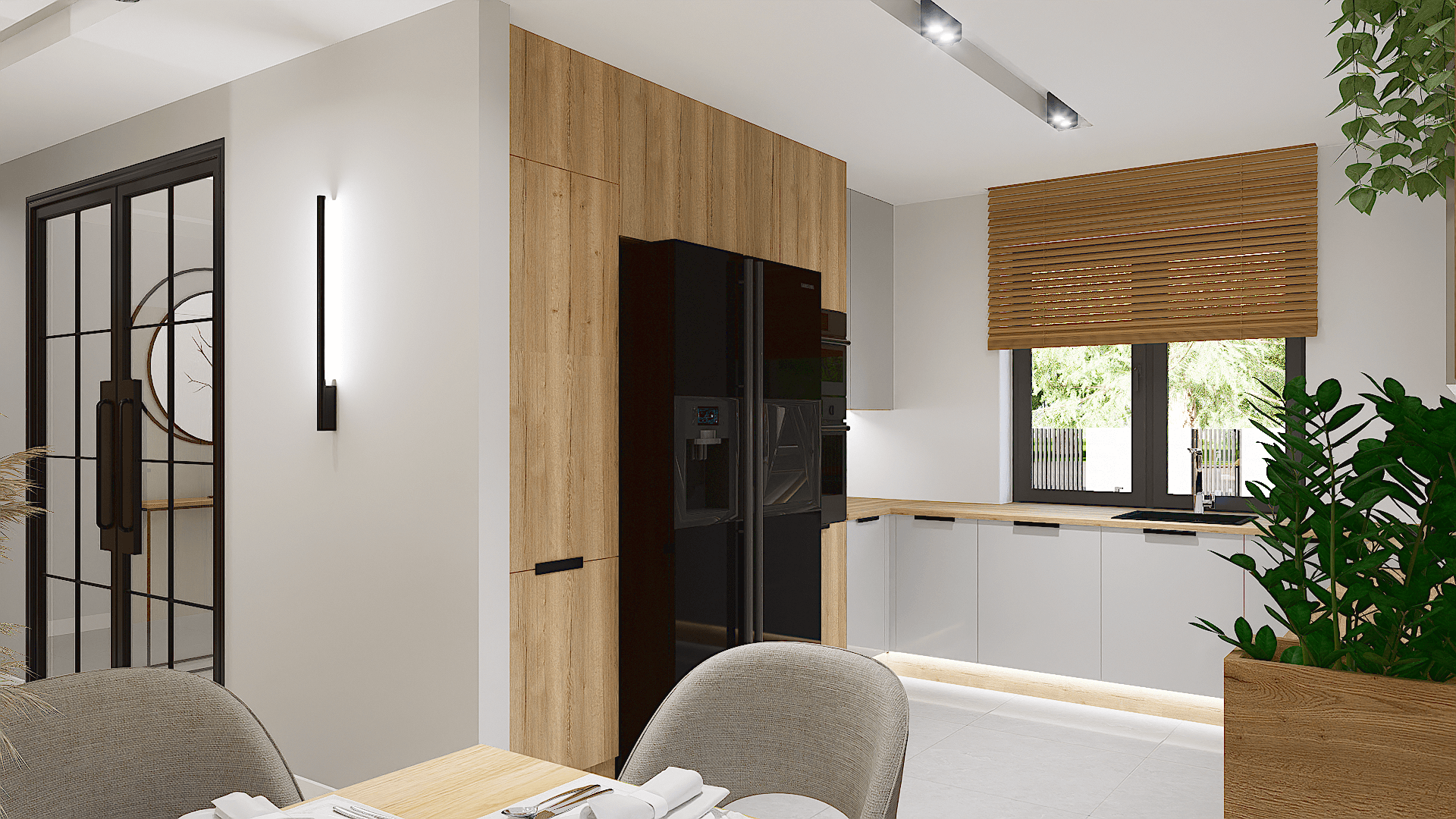 Na uwagę zasługuje obszerny salon z aneksem kuchennym i miejscem na duży stół, gdzie wszyscy domownicy będą mogli wspólnie celebrować posiłki.