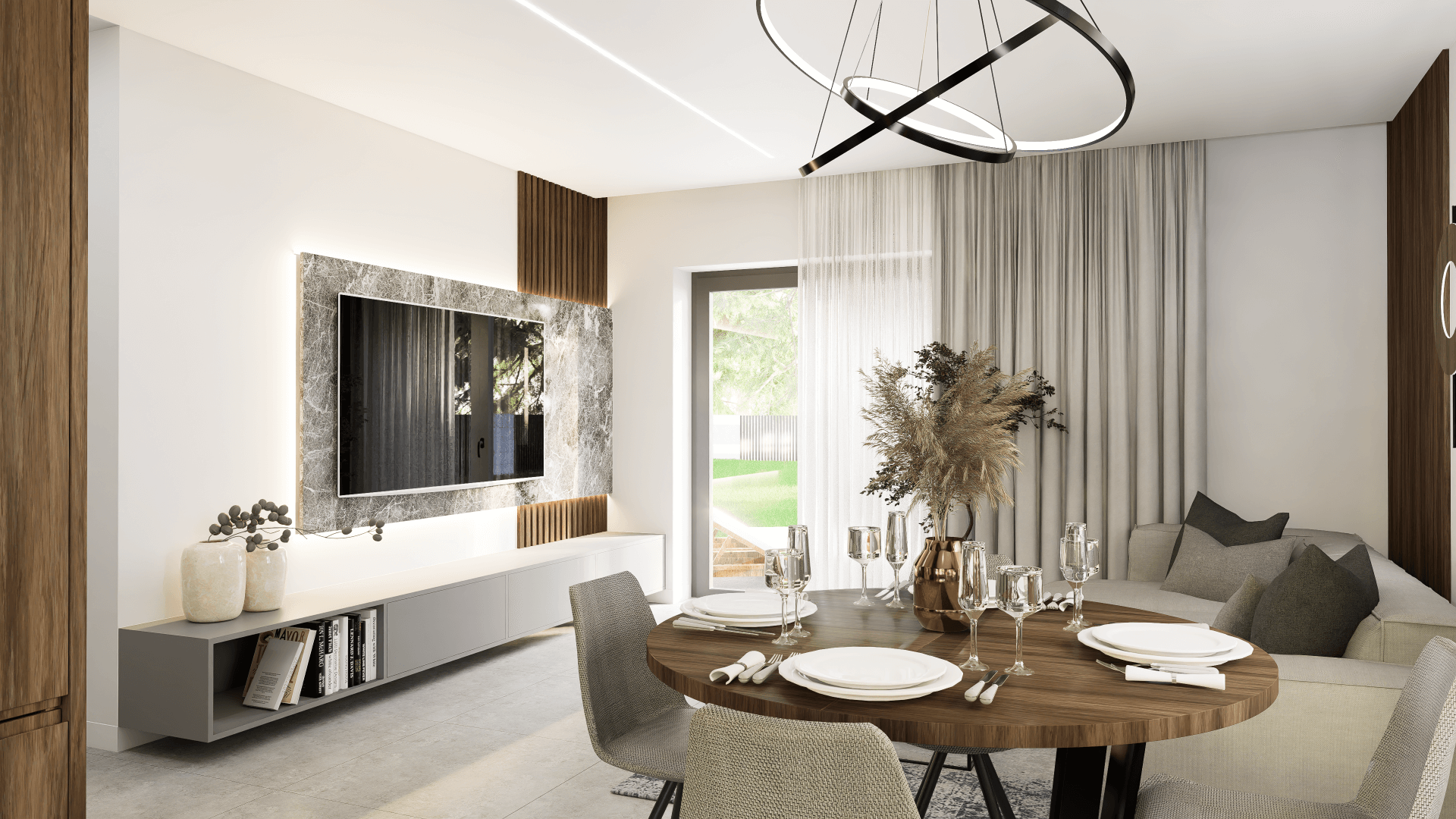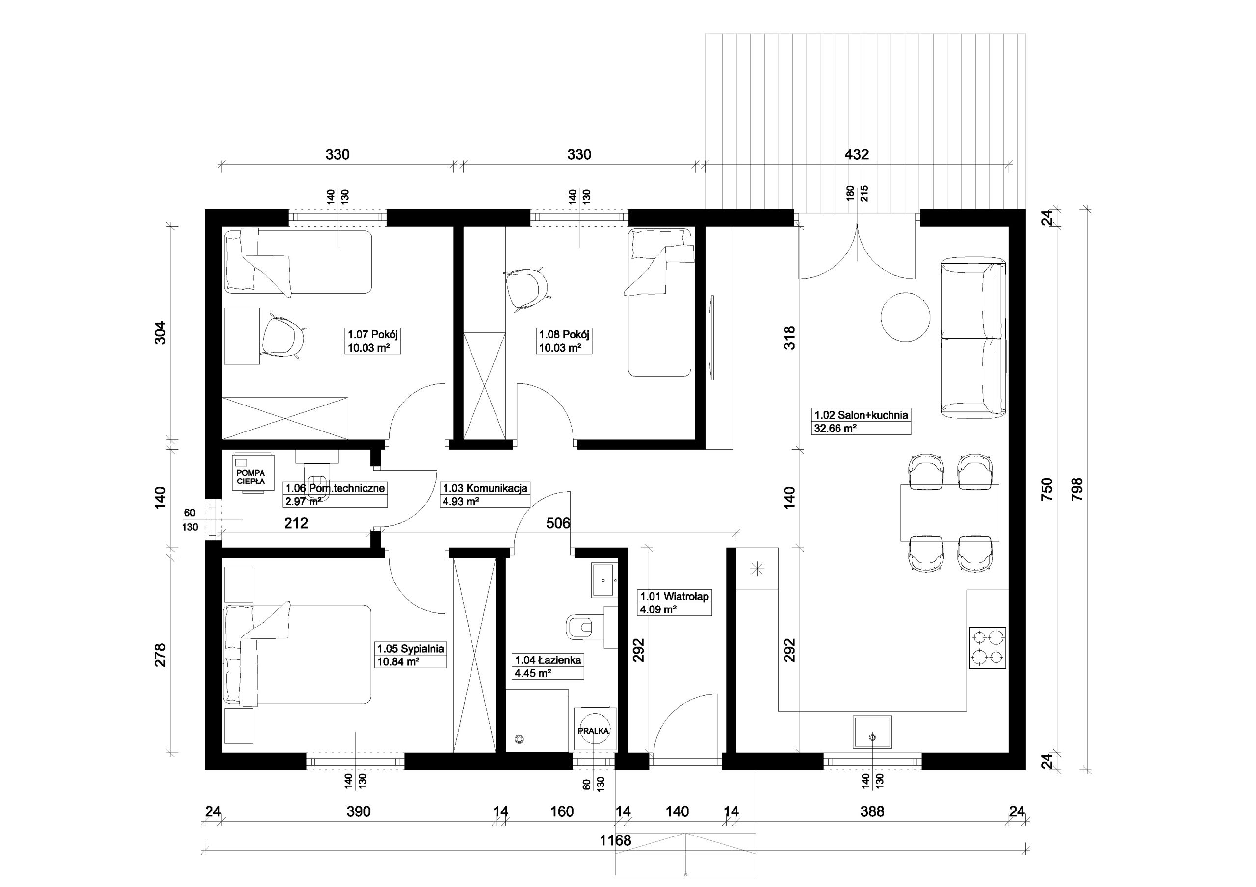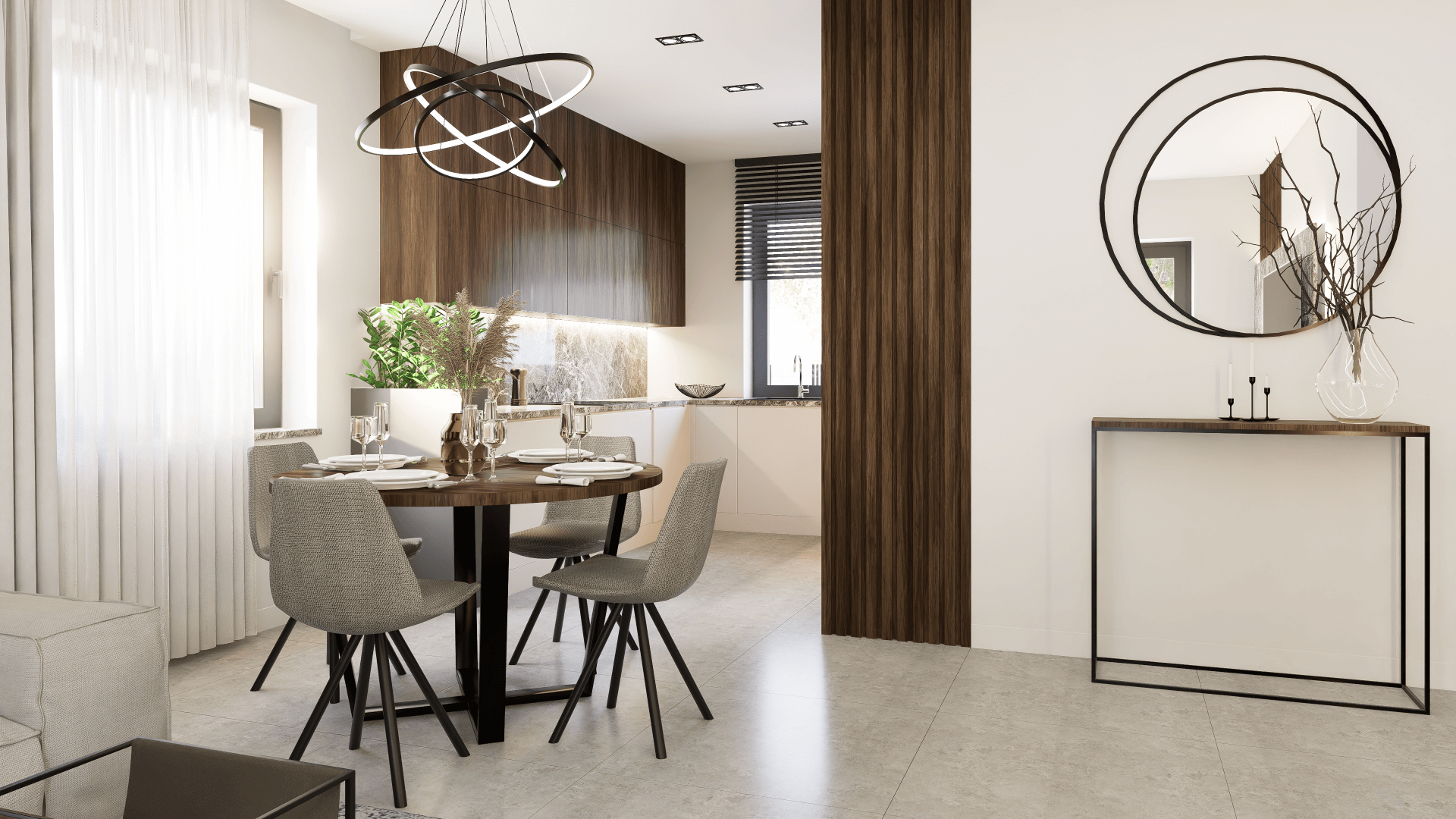 Ergonomiczny układ pomieszczeń sprawia, że nie tracimy przestrzeni na zbędną komunikację. Na uwagę zasługuje obszerny salon z miejscem na duży stół, gdzie wszyscy domownicy będą mogli wspólnie celebrować posiłki. Duża kuchnia może stać się centrum rodzinnych spotkań.