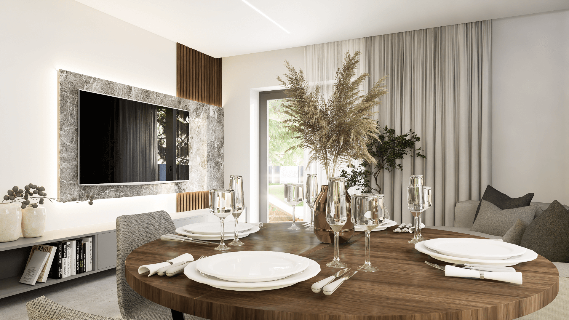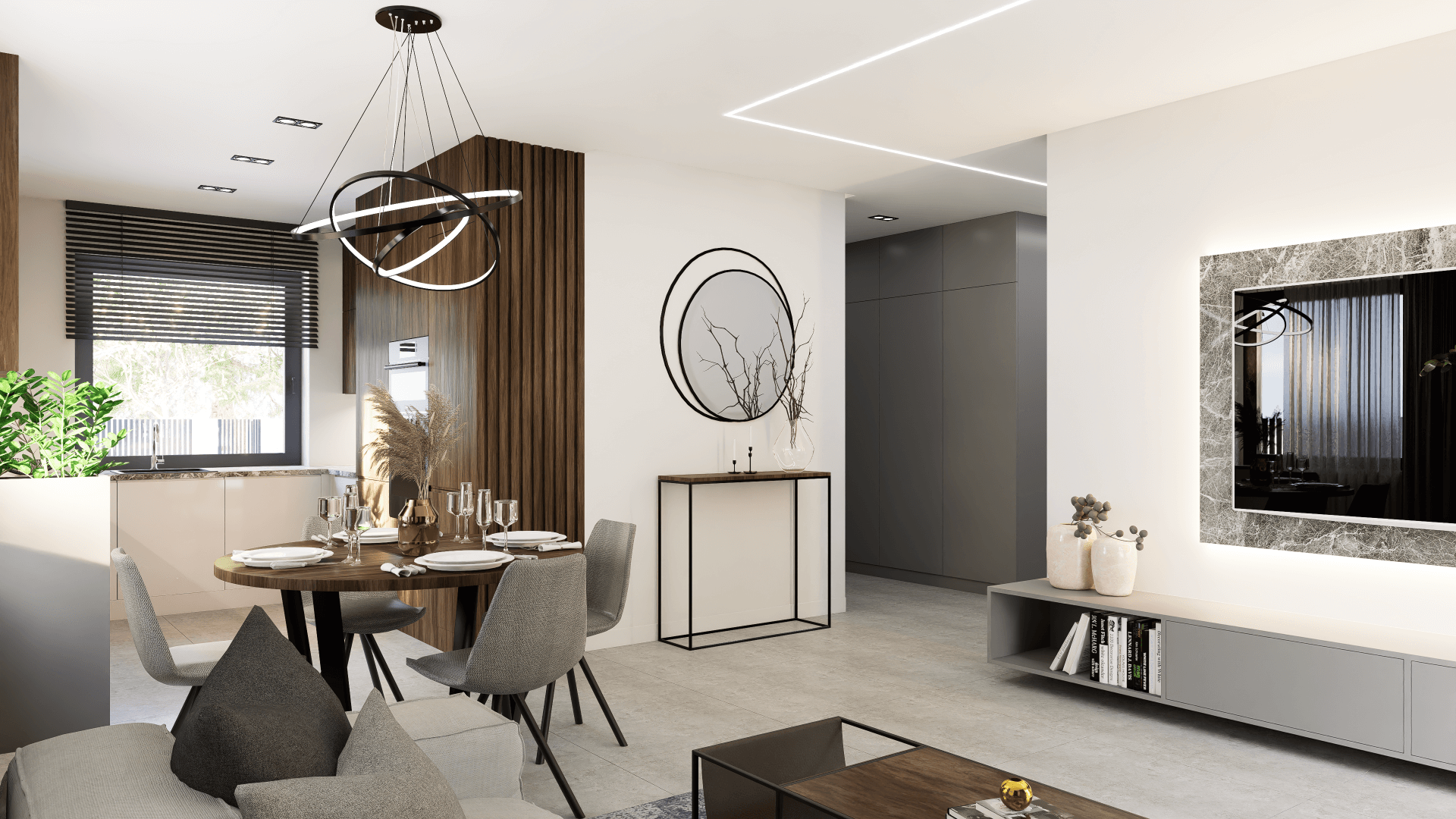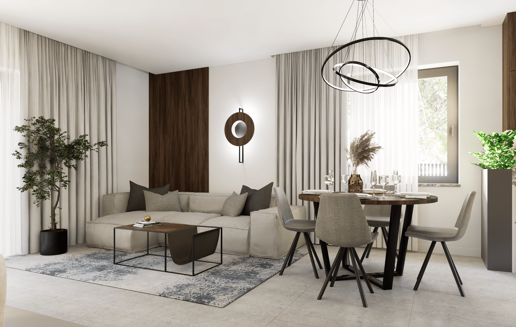 Ergonomiczny układ pomieszczeń sprawia, że nie tracimy przestrzeni na zbędną komunikację. Na uwagę zasługuje obszerny salon z miejscem na duży stół, gdzie wszyscy domownicy będą mogli wspólnie celebrować posiłki. Duża kuchnia może stać się centrum rodzinnych spotkań.
